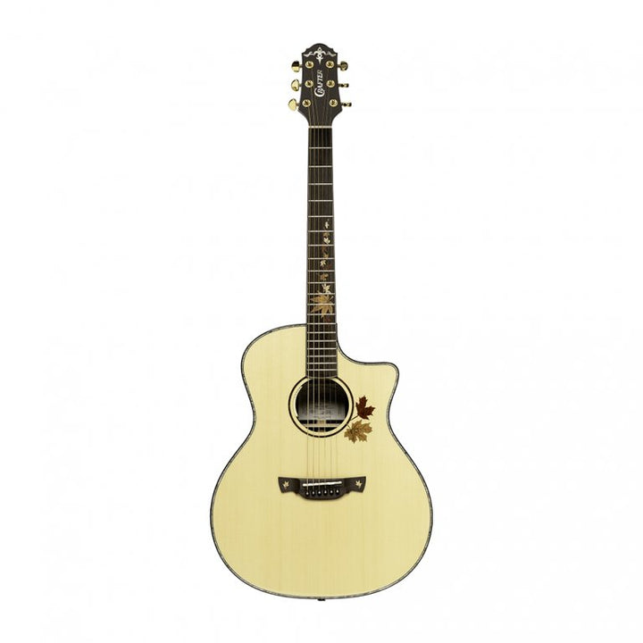 Shopping for a genuinely high-end acoustic without splashing for a big-name headstock? The Crafter AL G-1000CE is a Grand Auditorium cutaway with solid Engelmann spruce over solid Indian rosewood—a classic pairing known for sparkling highs, warm lows and rich overtones. Tasteful abalone details and the signature Autumn Leaves fingerboard inlay add a refined look. On stage, the factory-fitted LR Baggs Anthem blends internal mic and undersaddle pickup for a natural, feedback-resistant sound you can trust. Supplied with a gigbag.