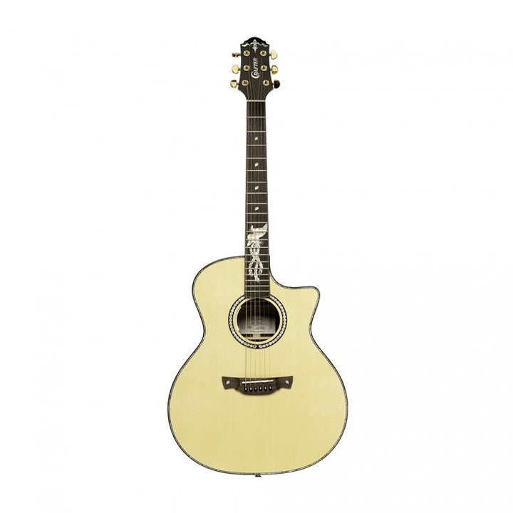 After a high-end acoustic that sounds as good as it looks? The Crafter PK G-1000CE is a Grand Auditorium cutaway built from solid Engelmann spruce and solid Indian rosewood—a timeless pairing known for sparkling highs, warm lows and musical overtones. The signature Peacock abalone inlay work adds a standout visual, while the factory-fitted LR Baggs Anthem system blends internal mic and undersaddle pickup for a natural, feedback-resistant sound on stage or in the studio. Supplied with a gigbag.