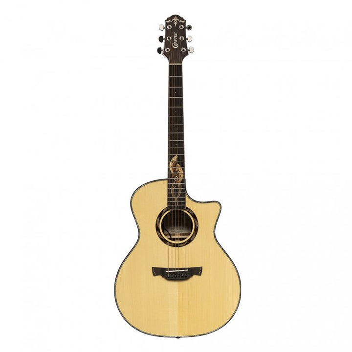 After a serious high-end acoustic that’s easy to gig and record? The Crafter SM G-MAHO CE couples a lively solid Engelmann spruce top with a solid mahogany back (laminated mahogany sides) for a warm, focused voice with clear mids and smooth lows. The Grand Auditorium cutaway is comfortable and balanced, and the LR Baggs Anthem (rosette-mounted controls) blends internal mic and undersaddle pickup so the plugged-in sound stays natural. Finished with the distinctive “Salmon” fingerboard inlay, abalone accents, and Grover gold tuners. Supplied with a gigbag.