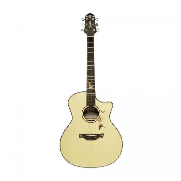 Hunting for a serious high-end acoustic that sounds open and natural on stage? The Crafter TB G-MAHO CE pairs a lively solid Engelmann spruce top with a solid mahogany back (laminated mahogany sides) for a warm, focused voice with clear mids and smooth lows. The comfortable Grand Auditorium cutaway keeps things balanced for fingerstyle and strumming, and the factory DS-2 dual-source system—undersaddle piezo + soundhole gooseneck condenser mic—lets you blend pickup punch with real air and body resonance. Finished with the elegant Twin Birds fingerboard inlay, abalone purfling, and Grover gold tuners. Supplied with a gigbag.