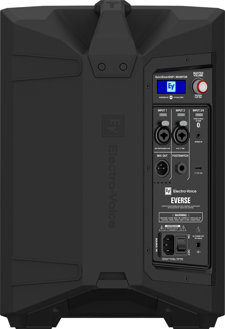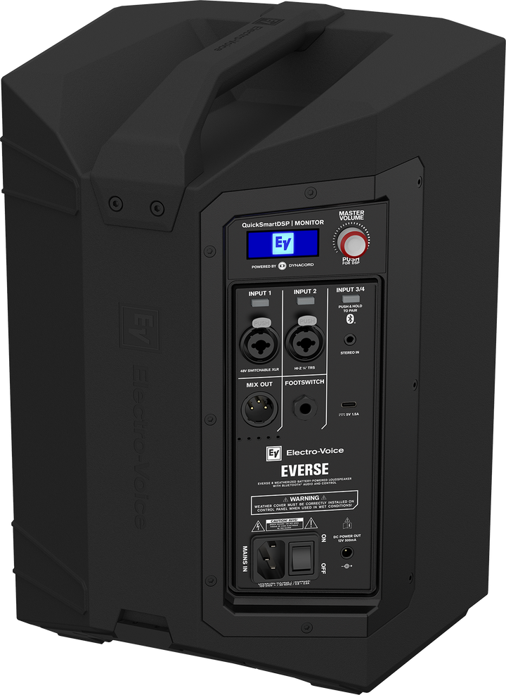 Electro-Voice EVERSE 8 is a fully portable, battery-powered loudspeaker designed for real PA performance indoors or out. It delivers up to 121 dB SPL with wide 100° × 100° coverage, Bluetooth® audio + app control, and a built-in 4-channel digital mixer with studio-grade processing. The weatherized design (with the included input cover) and long-life Li-ion battery make it a dependable grab-and-go system for musicians, DJs, instructors, events and speech.
