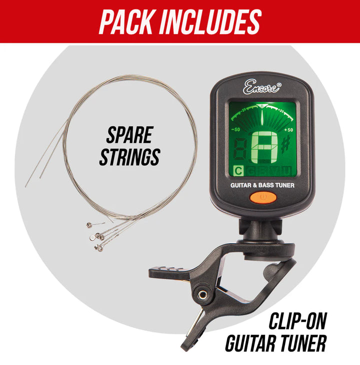 A complete first-guitar package built to get players started the right way. The Encore Blaster E90 single-cut electric pairs a comfortable, beginner-friendly setup with two humbuckers for versatile tones. The pack includes a Kinsman 10-watt combo (with clean/drive and 3-band EQ), clip-on tuner, gig bag, strap, lead, spare strings, picks—and access to free online lessons from Your Guitar Academy.