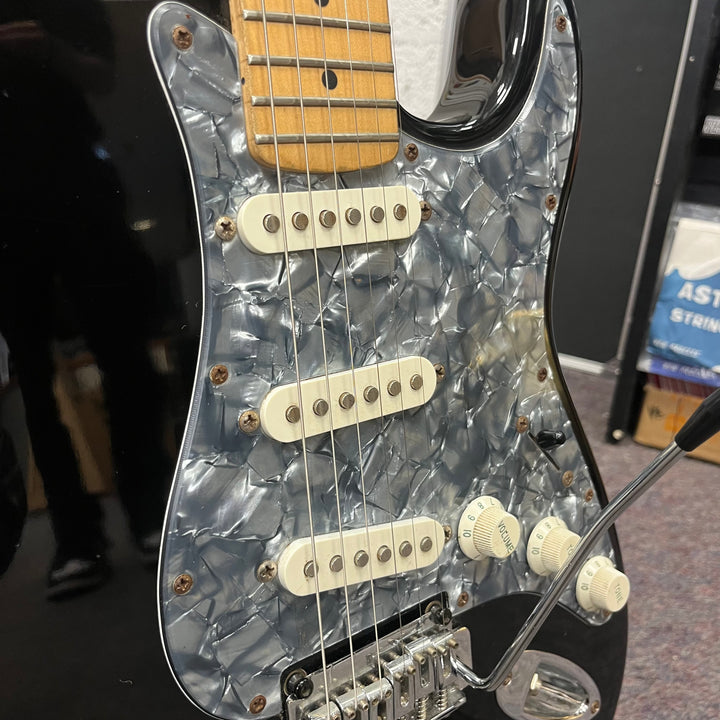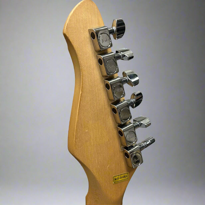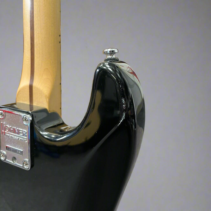 A sleeper from the early-90s that punches well above its price. This Hohner Professional ST 59 is a Korean-made Strat-style instrument with classic specs and a lively, open tone—think 90s MIM Strat territory, with a bit more bite. It carries three Hohner GS-1 single coils on a 5-way, a bolt-on Canadian rock maple neck, 22 nickel-silver frets, graphite nut, and full Strat controls (vol/tone/tone). This example is black with a pearloid pickguard and a maple fingerboard (most were rosewood—this one plays fast and snappy). The machine heads have been upgraded to genuine Fender tuners for smoother, steadier tuning.