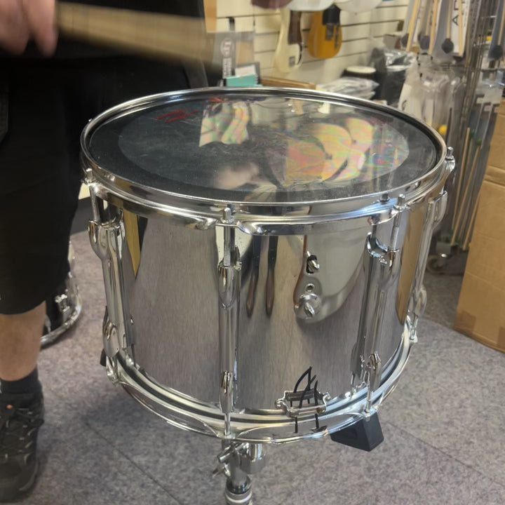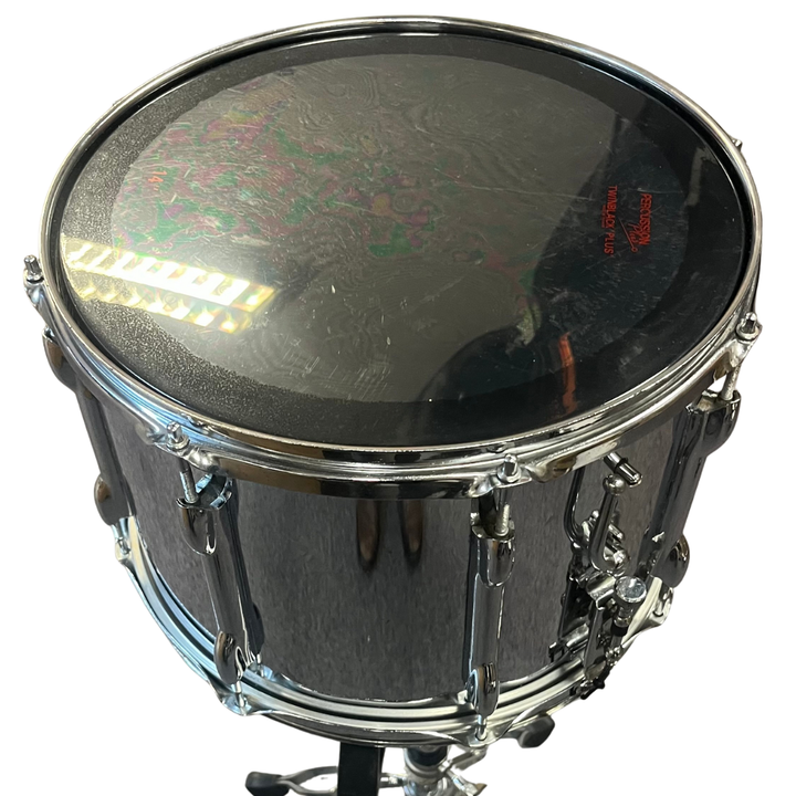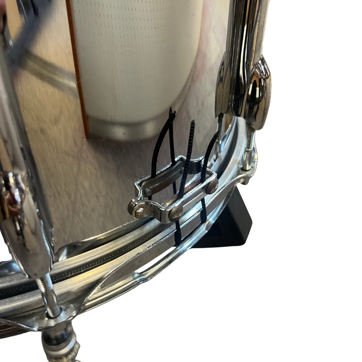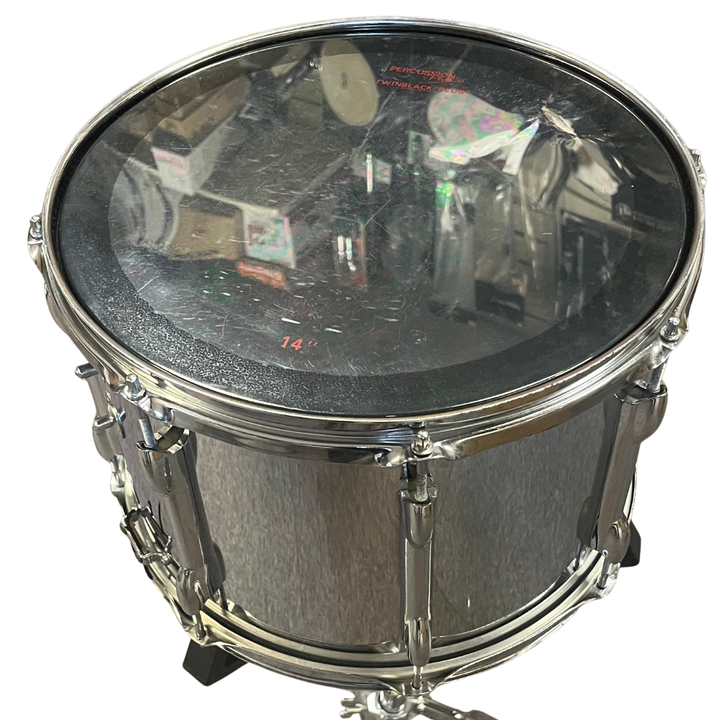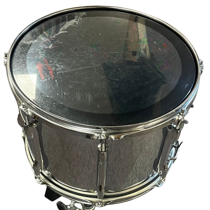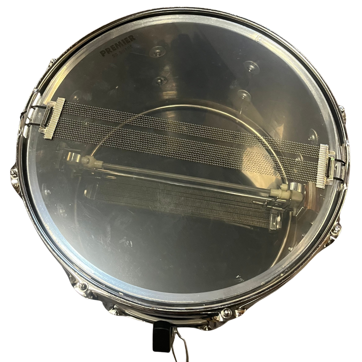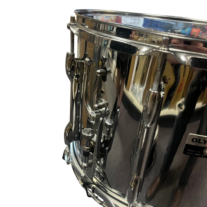 UK-made Olympic by Premier marching snare with top and bottom snares. The internal top-snare mechanism provides tight, dry articulation under the batter head, while a separate external parallel throw controls the bottom snare for crisp response. The 14" x 9" chrome-over-steel shell delivers bright projection and punch—ideal for parade work, ensemble use, or as a characterful high-tension studio snare.