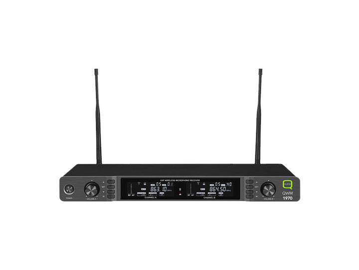 The Q-Audio QWM 1970 RX is the replacement dual-channel UHF receiver for the QWM 1970 wireless systems. It’s available in Channel 38 (606–614 MHz) and Channel 70 (863–865 MHz)—choose the band to match your existing transmitters. The unit supports IR sync for quick pairing and works with Q-Audio QWM 1970 handheld and bodypack transmitters for dependable speech and performance use.