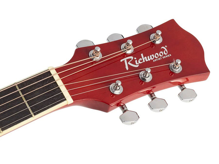 The Richwood RA-12-RS is an easy-playing auditorium-size steel-string finished in a classic red sunburst gloss. A spruce top with scalloped X-bracing delivers clear strumming and articulate chords, while the slightly smaller body than a dreadnought makes it comfortable for new players and anyone who prefers a closer fit. Reliable hardware (die-cast tuners, two-way truss rod) keeps setup simple and stable.