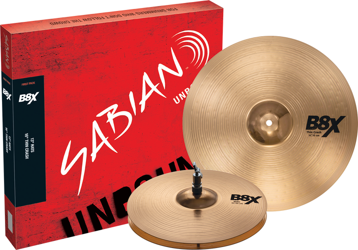 Sonically matched in the SABIAN Vault, the SABIAN B8X First Pack includes 13" B8X Hi-Hats and a 16" B8X Crash. A perfect first set for the serious and discerning beginner. Precision formed, hammered and lathed for pure, tonally tight sounds, B8X is the bright, cutting sound of pure Bronze … at a low price that makes your first move into this precious metal an easy one.
