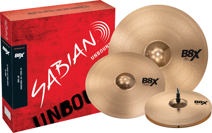 Sonically matched in the SABIAN Vault, the SABIAN B8X Performance Set includes 14" B8X Hi-Hats, 16" B8X Thin Crash and a 20" B8X Ride. An ideal performance-ready set for the serious and discerning beginner. Precision formed, hammered and lathed for pure, tonally tight sounds, B8X is the bright, cutting sound of pure Bronze … at a low price that makes your first move into this precious metal an easy one.