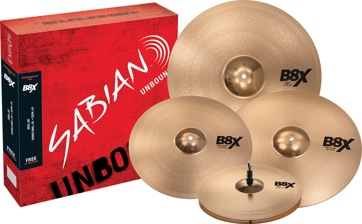 The Sabian B8X Performance Set Plus (45003XG) gives you the core cymbals to outfit a kit and a bonus crash for bigger accents. The pack includes 14" B8X Hi-Hats, 16" Thin Crash, 20" Ride, plus a FREE 18" Thin Crash. B8X cymbals are precision-formed and hammered from B8 bronze for a bright, focused sound that cuts cleanly in rehearsal, recording, and live mixes.