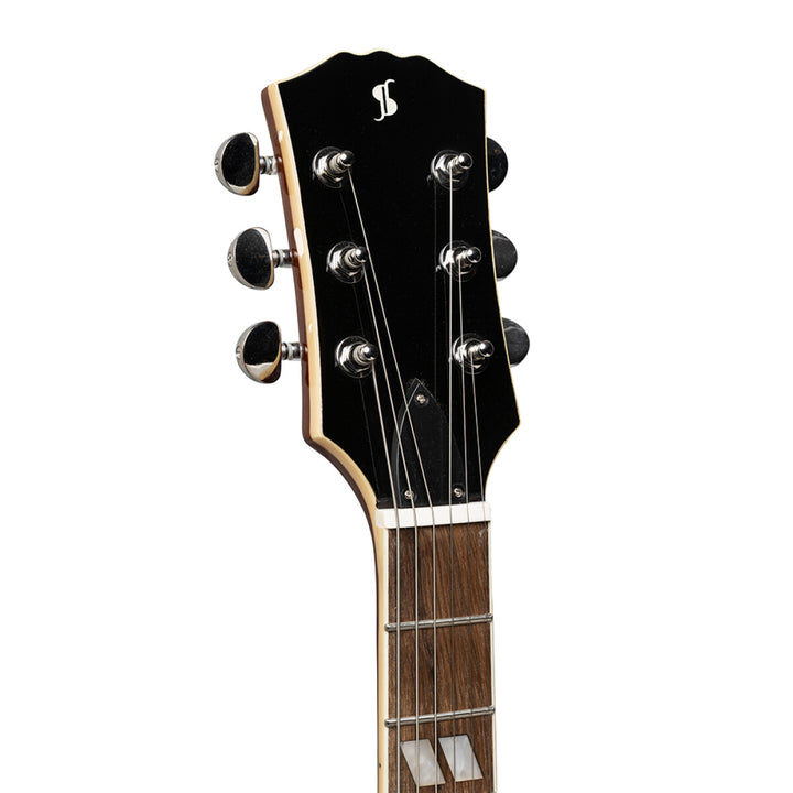 A classic single-cut from Stagg with the tonewood recipe players trust: a solid mahogany body and set-in neck topped with AAA flamed maple for bite and sustain. A satin-finished neck feels quick, stainless steel frets last longer, and the AlNiCo V humbuckers with push/pull volumes add coil-split options alongside familiar 2-volume/2-tone controls.