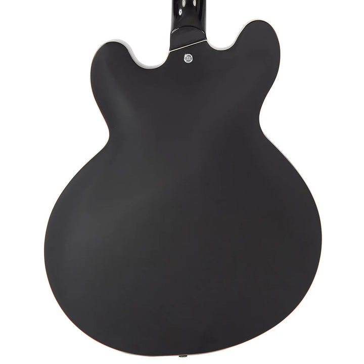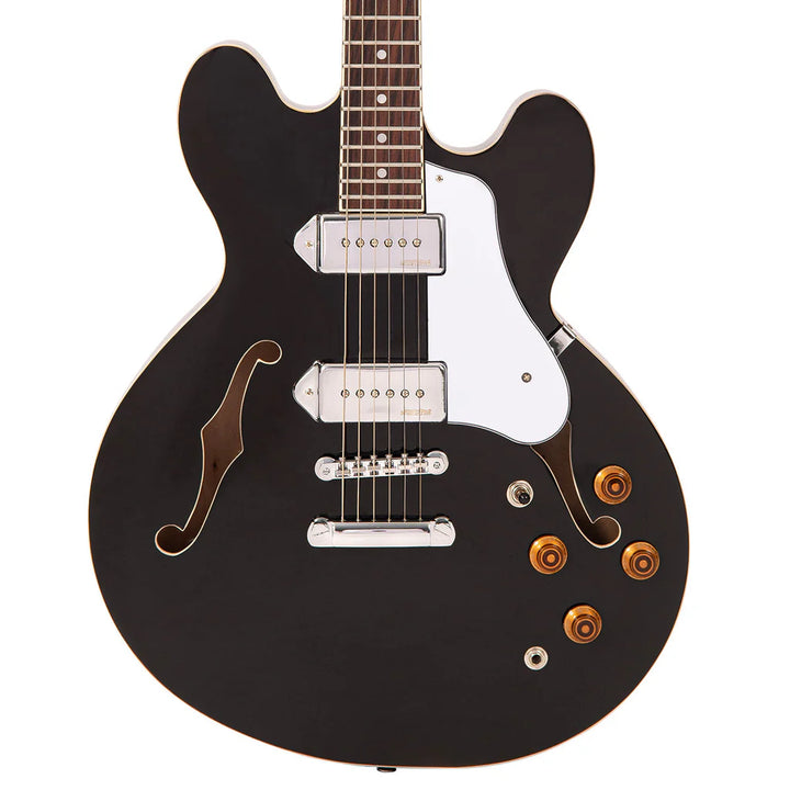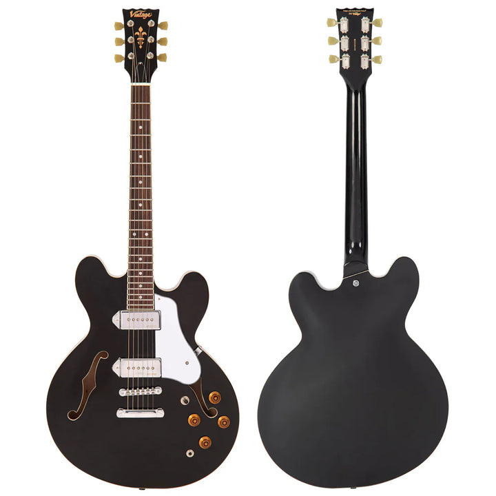 The Vintage VSA500P ReIssued Semi Acoustic Guitar in Boulevard Black combines timeless semi-hollow design with modern playability and tone. Featuring an elegant high-gloss finish, bound maple body, and bound mahogany neck, this model delivers both style and substance. Its twin Wilkinson® MW90 pickups offer the perfect blend of single-coil clarity and P-90 punch, making it a versatile choice for jazz, blues, rock, and beyond.